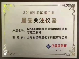 1、新仪产品“ MASTER超高通量密闭微波消解萃取工作站”获2016科学仪器行业最受关注仪器奖。